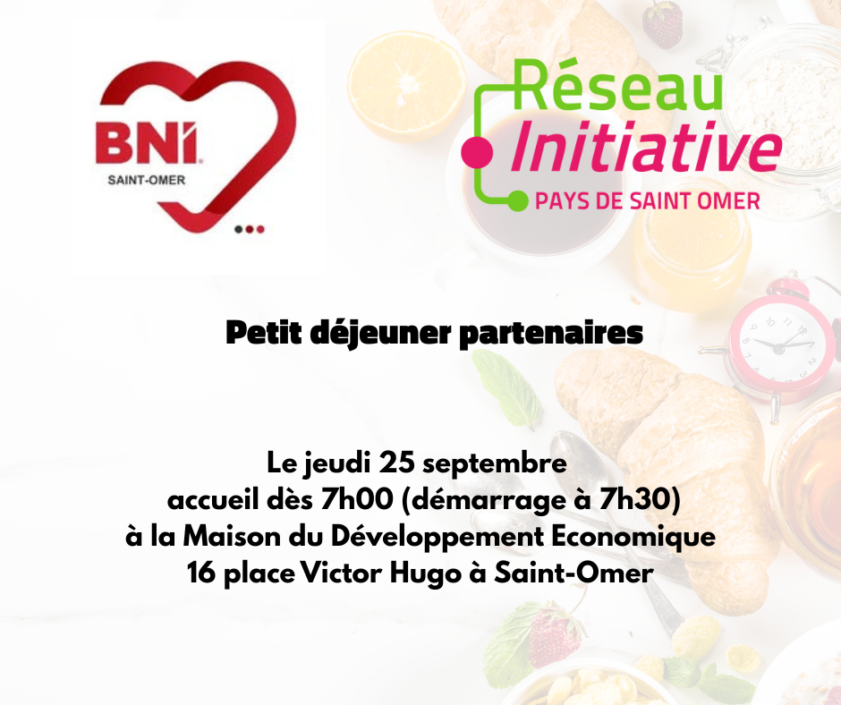 Nous avons le plaisir de vous convier à un petit-déjeuner de présentation commune organisé par Initiative Pays de Saint-Omer et le BNI de Saint-Omer.